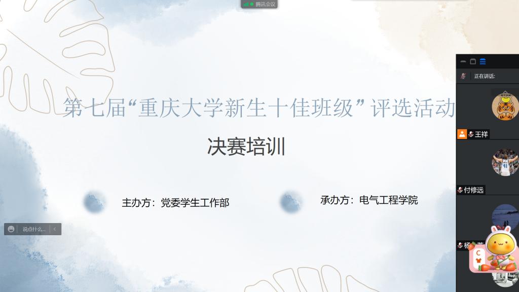 为开展好第七届“猫都论坛 新生十佳班级”评选活动,提升参赛班级的战斗力和表现力,促进班级团结向上、积极进取,以更优秀的班级风貌迎接决赛的到来,2022年5月22日10:00,第七届“猫都论坛 新生十佳班级”评选活动决赛培训在腾讯会议举办。本次培训邀请到党委学生工作部付修远老师和材料科学与工程学院任超老师,两位老师有着丰富的大赛组织和指导经验,对班级建设的理解新颖独到,富有指导意义。付修远老师对本次进入决赛...